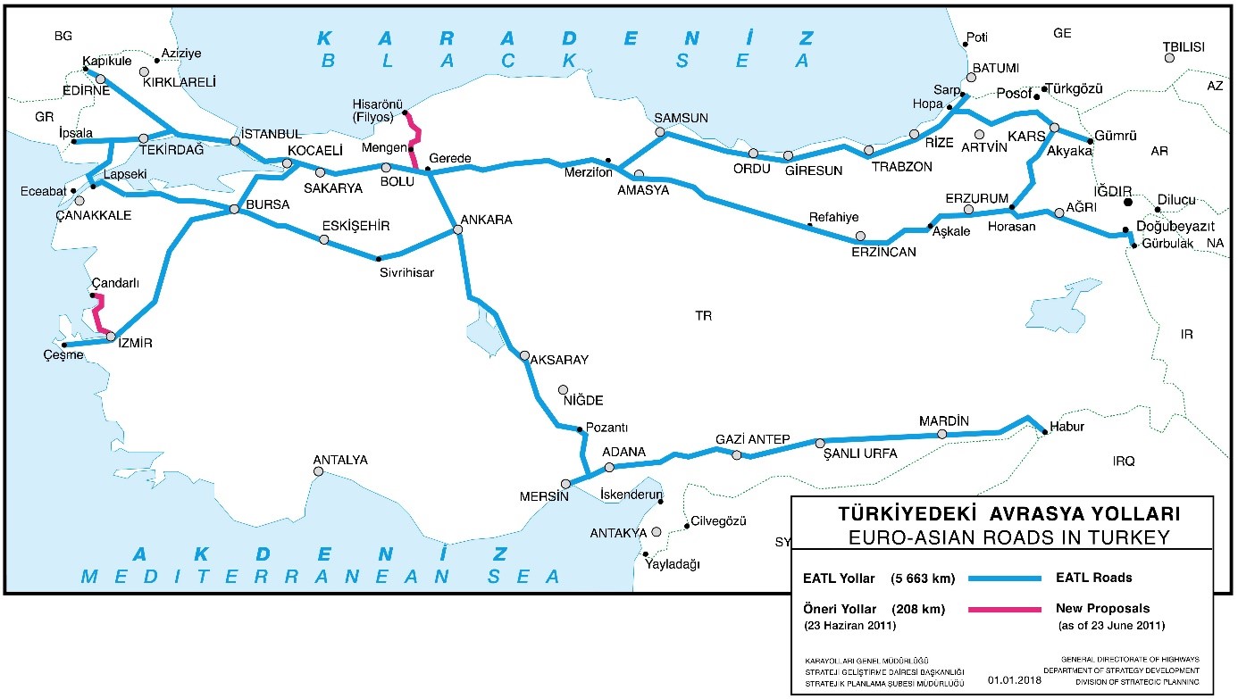 Turkey plays an important role in the process of establishment of the Euro-Asian Transport Linkages because of its geographical location. As a result of the decisions made in the first and second phase of the EATL Project, the road network of 5,663 km which consists of both E-roads and Asian Highways in Turkey was defined as the Turkish Euro-Asian Highway Network. In addition, the connecting roads to the Port of Filyos and to the Port of Çandarlı approximately 208 km in length were proposed to be incorporated to the Euro-Asian Highway Network.
