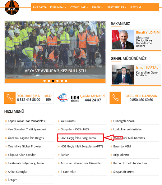 The users can use the section "OGS-HGS Geçiş İhlali Sorgulama (OGS-KGS Pass Violation Query)" from the main menu on www.kgm.gov.tr