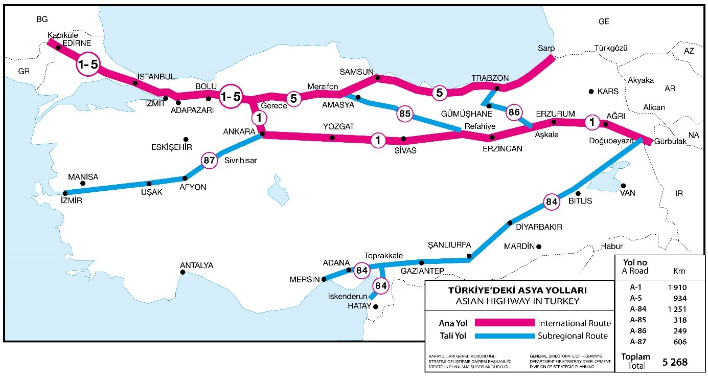 1998 yılında Türkiye sınırları dahilindeki Asya Karayolu Ağının tespiti konusunda başlatılan çalışmalar kapsamında güzergah başlangıçta 3.200 Km olarak belirlenmiştir. Ancak, ESCAP'a yeni üye olan (Gürcistan ve Azerbaycan) gibi ülkelere de bağlantı sağlanması talep edilmesi üzerine Asya Karayolu Ağına Karadeniz Sahil Yolu güzergahı ve Ankara – İstanbul Otoyolu da ilave edilmiştir. Türkiye'deki Asya Karayolu Ağının uzunluğu 5.268 Km'dir.